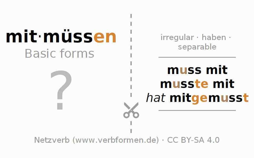 With the flash cards the conjugation of the German verbs can be learned and trained. To do this, follow the tasks on the learning sheets for the verb mitmüssen. The required verb forms must be solved in the head. They are then compared with the hints on the cards. If agree, you confirm your learning result. If there is a deviation, you should use the hints to memorize the unknown forms. Typically, print the PDF file of the learning cards and fold them as specified. So you can use them on a stack with other verbs for learning. There are also many more worksheets for the verb mitmüssen. All materials are available as Open Educational Resources (OER) under license CC BY- SA 4.0 and can be used free of charge.