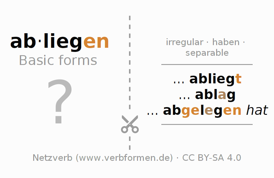 With the flash cards the conjugation of the German verbs can be learned and trained. To do this, follow the tasks on the learning sheets for the verb abliegen. The required verb forms must be solved in the head. They are then compared with the hints on the cards. If agree, you confirm your learning result. If there is a deviation, you should use the hints to memorize the unknown forms. Typically, print the PDF file of the learning cards and fold them as specified. So you can use them on a stack with other verbs for learning. There are also many more worksheets for the verb abliegen. All materials are available as Open Educational Resources (OER) under license CC BY- SA 4.0 and can be used free of charge.