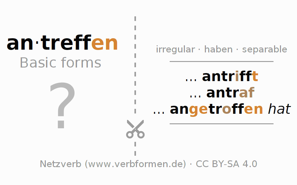 With the flash cards the conjugation of the German verbs can be learned and trained. To do this, follow the tasks on the learning sheets for the verb antreffen. The required verb forms must be solved in the head. They are then compared with the hints on the cards. If agree, you confirm your learning result. If there is a deviation, you should use the hints to memorize the unknown forms. Typically, print the PDF file of the learning cards and fold them as specified. So you can use them on a stack with other verbs for learning. There are also many more worksheets for the verb antreffen. All materials are available as Open Educational Resources (OER) under license CC BY- SA 4.0 and can be used free of charge.