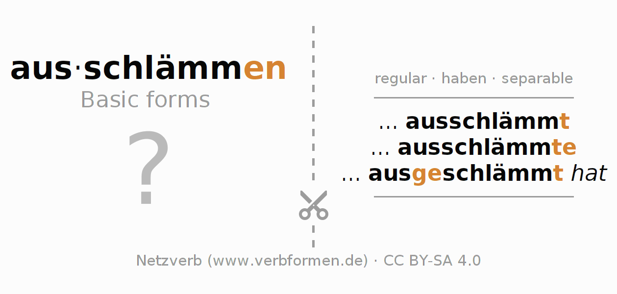 With the flash cards the conjugation of the German verbs can be learned and trained. To do this, follow the tasks on the learning sheets for the verb ausschlämmen. The required verb forms must be solved in the head. They are then compared with the hints on the cards. If agree, you confirm your learning result. If there is a deviation, you should use the hints to memorize the unknown forms. Typically, print the PDF file of the learning cards and fold them as specified. So you can use them on a stack with other verbs for learning. There are also many more worksheets for the verb ausschlämmen. All materials are available as Open Educational Resources (OER) under license CC BY- SA 4.0 and can be used free of charge.