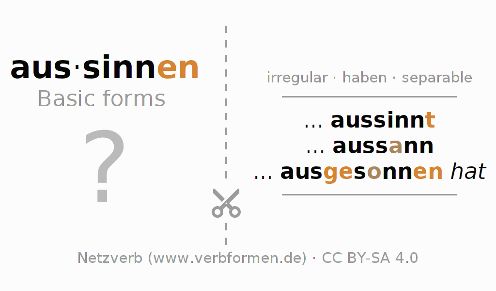 With the flash cards the conjugation of the German verbs can be learned and trained. To do this, follow the tasks on the learning sheets for the verb aussinnen. The required verb forms must be solved in the head. They are then compared with the hints on the cards. If agree, you confirm your learning result. If there is a deviation, you should use the hints to memorize the unknown forms. Typically, print the PDF file of the learning cards and fold them as specified. So you can use them on a stack with other verbs for learning. There are also many more worksheets for the verb aussinnen. All materials are available as Open Educational Resources (OER) under license CC BY- SA 4.0 and can be used free of charge.