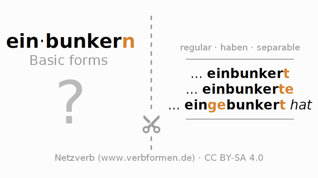 With the flash cards the conjugation of the German verbs can be learned and trained. To do this, follow the tasks on the learning sheets for the verb einbunkern. The required verb forms must be solved in the head. They are then compared with the hints on the cards. If agree, you confirm your learning result. If there is a deviation, you should use the hints to memorize the unknown forms. Typically, print the PDF file of the learning cards and fold them as specified. So you can use them on a stack with other verbs for learning. There are also many more worksheets for the verb einbunkern. All materials are available as Open Educational Resources (OER) under license CC BY- SA 4.0 and can be used free of charge.