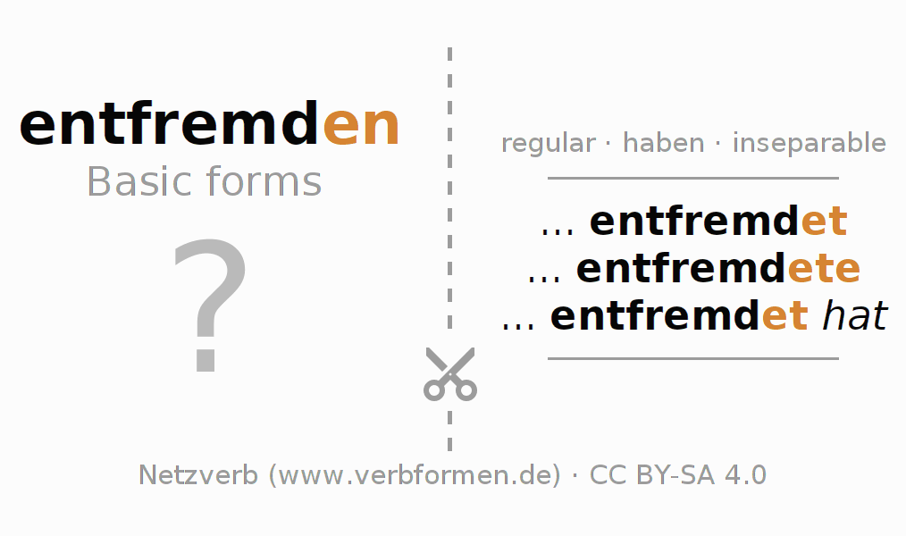 With the flash cards the conjugation of the German verbs can be learned and trained. To do this, follow the tasks on the learning sheets for the verb entfremden. The required verb forms must be solved in the head. They are then compared with the hints on the cards. If agree, you confirm your learning result. If there is a deviation, you should use the hints to memorize the unknown forms. Typically, print the PDF file of the learning cards and fold them as specified. So you can use them on a stack with other verbs for learning. There are also many more worksheets for the verb entfremden. All materials are available as Open Educational Resources (OER) under license CC BY- SA 4.0 and can be used free of charge.