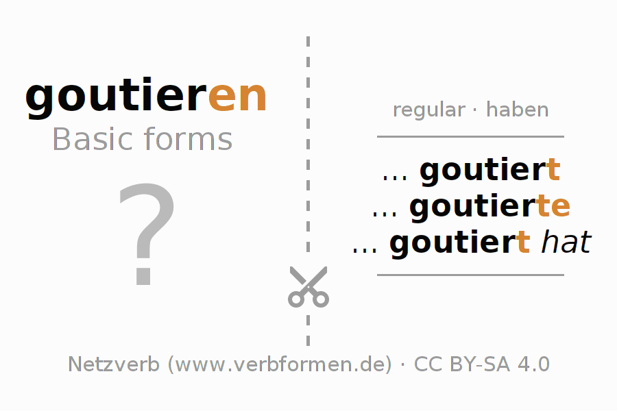 With the flash cards the conjugation of the German verbs can be learned and trained. To do this, follow the tasks on the learning sheets for the verb goutieren. The required verb forms must be solved in the head. They are then compared with the hints on the cards. If agree, you confirm your learning result. If there is a deviation, you should use the hints to memorize the unknown forms. Typically, print the PDF file of the learning cards and fold them as specified. So you can use them on a stack with other verbs for learning. There are also many more worksheets for the verb goutieren. All materials are available as Open Educational Resources (OER) under license CC BY- SA 4.0 and can be used free of charge.