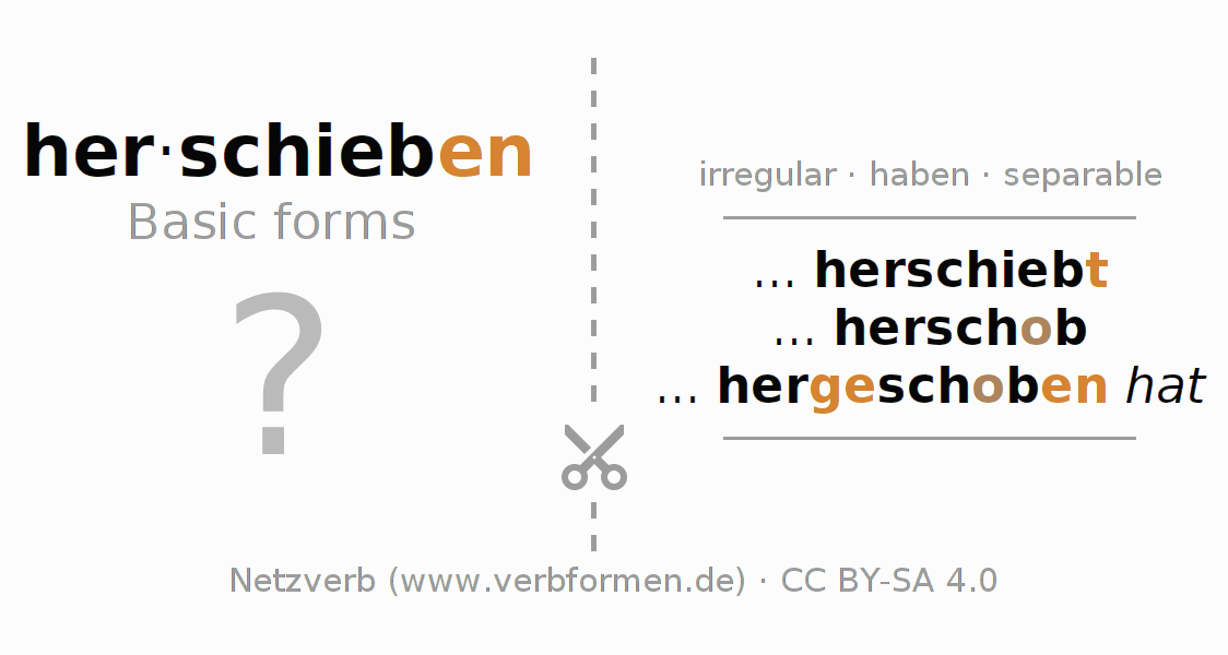 Instruction: Print and cut the learning cards of the herschieben. Then place the individual cards for several verbs on a pile and mix. Now the cards can be drawn. The information on the cards must be read in memory. To match your solution, use the information on the learning sheets.