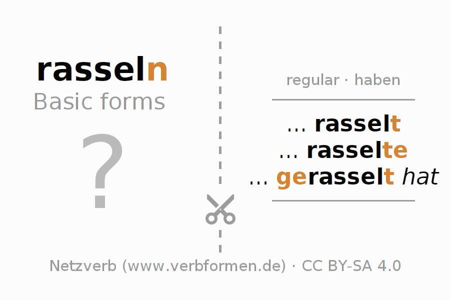With the flash cards the conjugation of the German verbs can be learned and trained. To do this, follow the tasks on the learning sheets for the verb rasseln. The required verb forms must be solved in the head. They are then compared with the hints on the cards. If agree, you confirm your learning result. If there is a deviation, you should use the hints to memorize the unknown forms. Typically, print the PDF file of the learning cards and fold them as specified. So you can use them on a stack with other verbs for learning. There are also many more worksheets for the verb rasseln. All materials are available as Open Educational Resources (OER) under license CC BY- SA 4.0 and can be used free of charge.