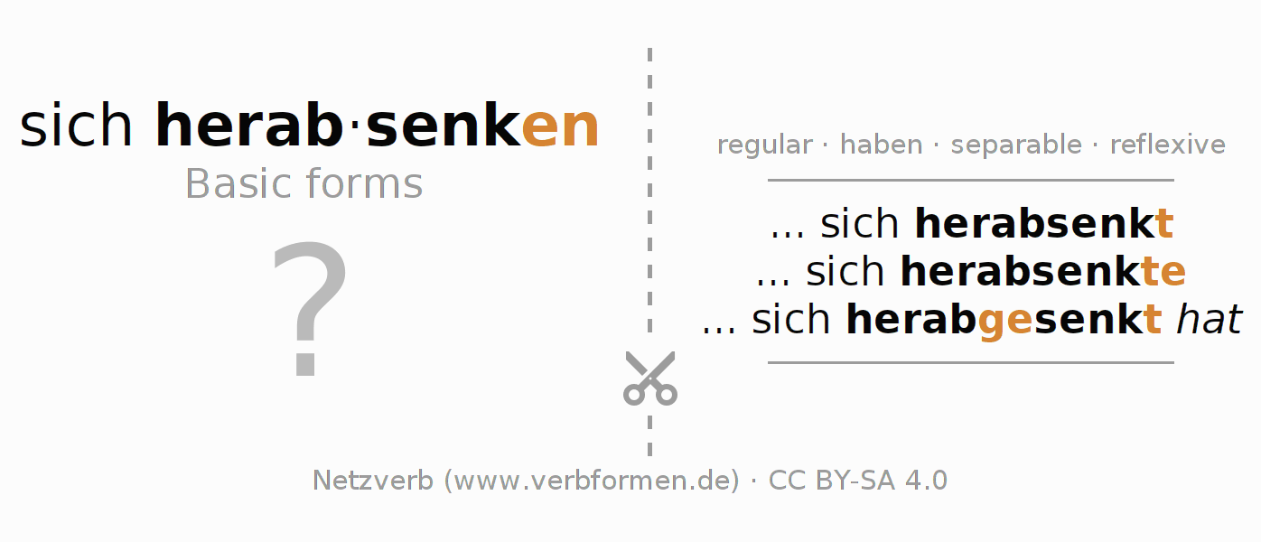 Instruction: Print and cut the learning cards of the sich herabsenken. Then place the individual cards for several verbs on a pile and mix. Now the cards can be drawn. The information on the cards must be read in memory. To match your solution, use the information on the learning sheets.