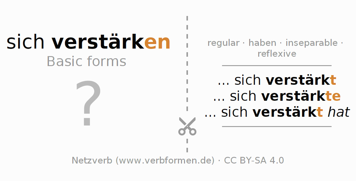 Instruction: Print and cut the learning cards of the sich verstärken. Then place the individual cards for several verbs on a pile and mix. Now the cards can be drawn. The information on the cards must be read in memory. To match your solution, use the information on the learning sheets.