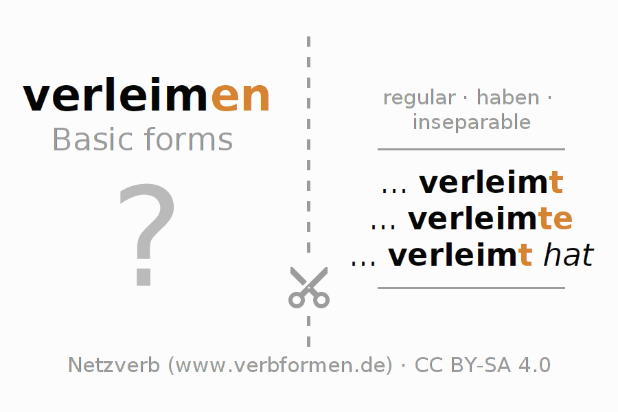 With the flash cards the conjugation of the German verbs can be learned and trained. To do this, follow the tasks on the learning sheets for the verb verleimen. The required verb forms must be solved in the head. They are then compared with the hints on the cards. If agree, you confirm your learning result. If there is a deviation, you should use the hints to memorize the unknown forms. Typically, print the PDF file of the learning cards and fold them as specified. So you can use them on a stack with other verbs for learning. There are also many more worksheets for the verb verleimen. All materials are available as Open Educational Resources (OER) under license CC BY- SA 4.0 and can be used free of charge.