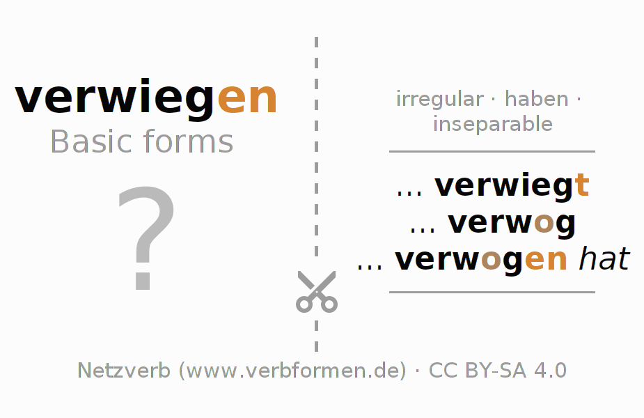 With the flash cards the conjugation of the German verbs can be learned and trained. To do this, follow the tasks on the learning sheets for the verb verwiegen. The required verb forms must be solved in the head. They are then compared with the hints on the cards. If agree, you confirm your learning result. If there is a deviation, you should use the hints to memorize the unknown forms. Typically, print the PDF file of the learning cards and fold them as specified. So you can use them on a stack with other verbs for learning. There are also many more worksheets for the verb verwiegen. All materials are available as Open Educational Resources (OER) under license CC BY- SA 4.0 and can be used free of charge.