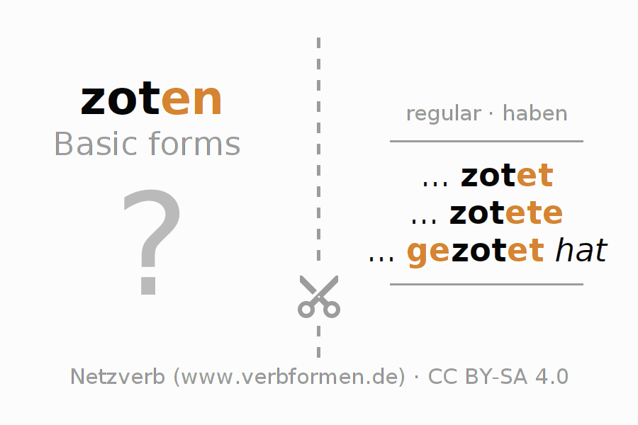With the flash cards the conjugation of the German verbs can be learned and trained. To do this, follow the tasks on the learning sheets for the verb zoten. The required verb forms must be solved in the head. They are then compared with the hints on the cards. If agree, you confirm your learning result. If there is a deviation, you should use the hints to memorize the unknown forms. Typically, print the PDF file of the learning cards and fold them as specified. So you can use them on a stack with other verbs for learning. There are also many more worksheets for the verb zoten. All materials are available as Open Educational Resources (OER) under license CC BY- SA 4.0 and can be used free of charge.
