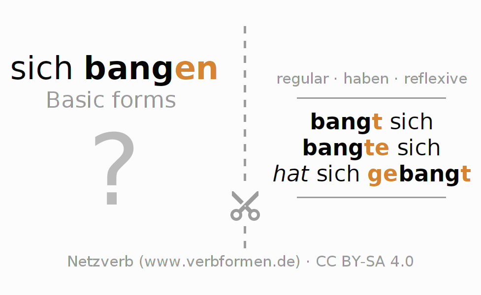 Instruction: Print and cut the learning cards of the sich bangen. Then place the individual cards for several verbs on a pile and mix. Now the cards can be drawn. The information on the cards must be read in memory. To match your solution, use the information on the learning sheets.
