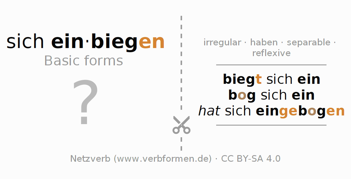Instruction: Print and cut the learning cards of the sich einbiegen. Then place the individual cards for several verbs on a pile and mix. Now the cards can be drawn. The information on the cards must be read in memory. To match your solution, use the information on the learning sheets.