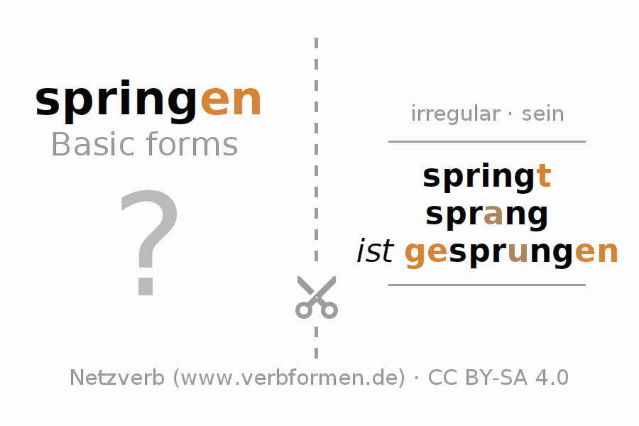 With the flash cards the conjugation of the German verbs can be learned and trained. To do this, follow the tasks on the learning sheets for the verb springen. The required verb forms must be solved in the head. They are then compared with the hints on the cards. If agree, you confirm your learning result. If there is a deviation, you should use the hints to memorize the unknown forms. Typically, print the PDF file of the learning cards and fold them as specified. So you can use them on a stack with other verbs for learning. There are also many more worksheets for the verb springen. All materials are available as Open Educational Resources (OER) under license CC BY- SA 4.0 and can be used free of charge.