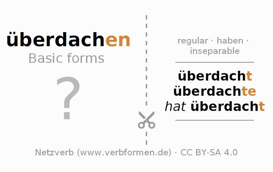 With the flash cards the conjugation of the German verbs can be learned and trained. To do this, follow the tasks on the learning sheets for the verb überdachen. The required verb forms must be solved in the head. They are then compared with the hints on the cards. If agree, you confirm your learning result. If there is a deviation, you should use the hints to memorize the unknown forms. Typically, print the PDF file of the learning cards and fold them as specified. So you can use them on a stack with other verbs for learning. There are also many more worksheets for the verb überdachen. All materials are available as Open Educational Resources (OER) under license CC BY- SA 4.0 and can be used free of charge.