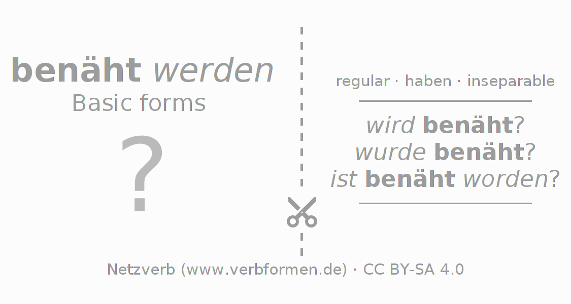Instruction: Print and cut the learning cards of the benähen. Then place the individual cards for several verbs on a pile and mix. Now the cards can be drawn. The information on the cards must be read in memory. To match your solution, use the information on the learning sheets.