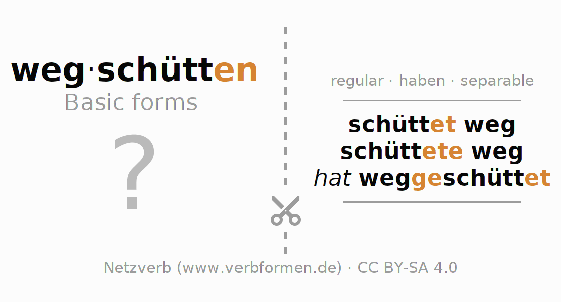 Instruction: Print and cut the learning cards of the wegschütten. Then place the individual cards for several verbs on a pile and mix. Now the cards can be drawn. The information on the cards must be read in memory. To match your solution, use the information on the learning sheets.