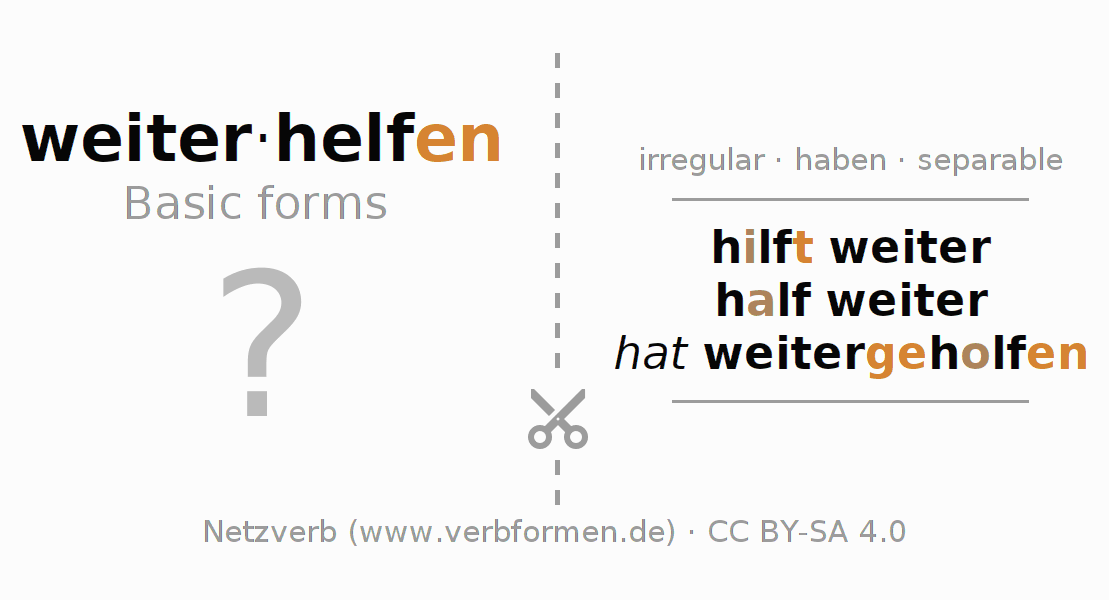 Instruction: Print and cut the learning cards of the weiterhelfen. Then place the individual cards for several verbs on a pile and mix. Now the cards can be drawn. The information on the cards must be read in memory. To match your solution, use the information on the learning sheets.