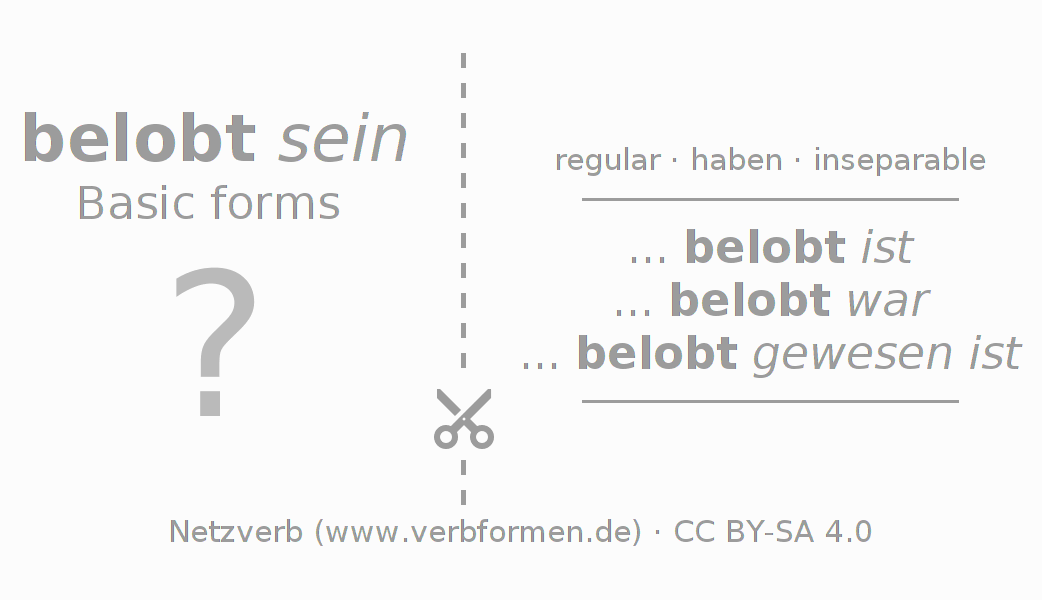 With the flash cards the conjugation of the German verbs can be learned and trained. To do this, follow the tasks on the learning sheets for the verb beloben. The required verb forms must be solved in the head. They are then compared with the hints on the cards. If agree, you confirm your learning result. If there is a deviation, you should use the hints to memorize the unknown forms. Typically, print the PDF file of the learning cards and fold them as specified. So you can use them on a stack with other verbs for learning. There are also many more worksheets for the verb beloben. All materials are available as Open Educational Resources (OER) under license CC BY- SA 4.0 and can be used free of charge.
