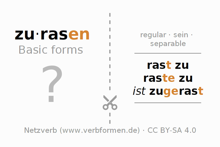 With the flash cards the conjugation of the German verbs can be learned and trained. To do this, follow the tasks on the learning sheets for the verb zurasen. The required verb forms must be solved in the head. They are then compared with the hints on the cards. If agree, you confirm your learning result. If there is a deviation, you should use the hints to memorize the unknown forms. Typically, print the PDF file of the learning cards and fold them as specified. So you can use them on a stack with other verbs for learning. There are also many more worksheets for the verb zurasen. All materials are available as Open Educational Resources (OER) under license CC BY- SA 4.0 and can be used free of charge.