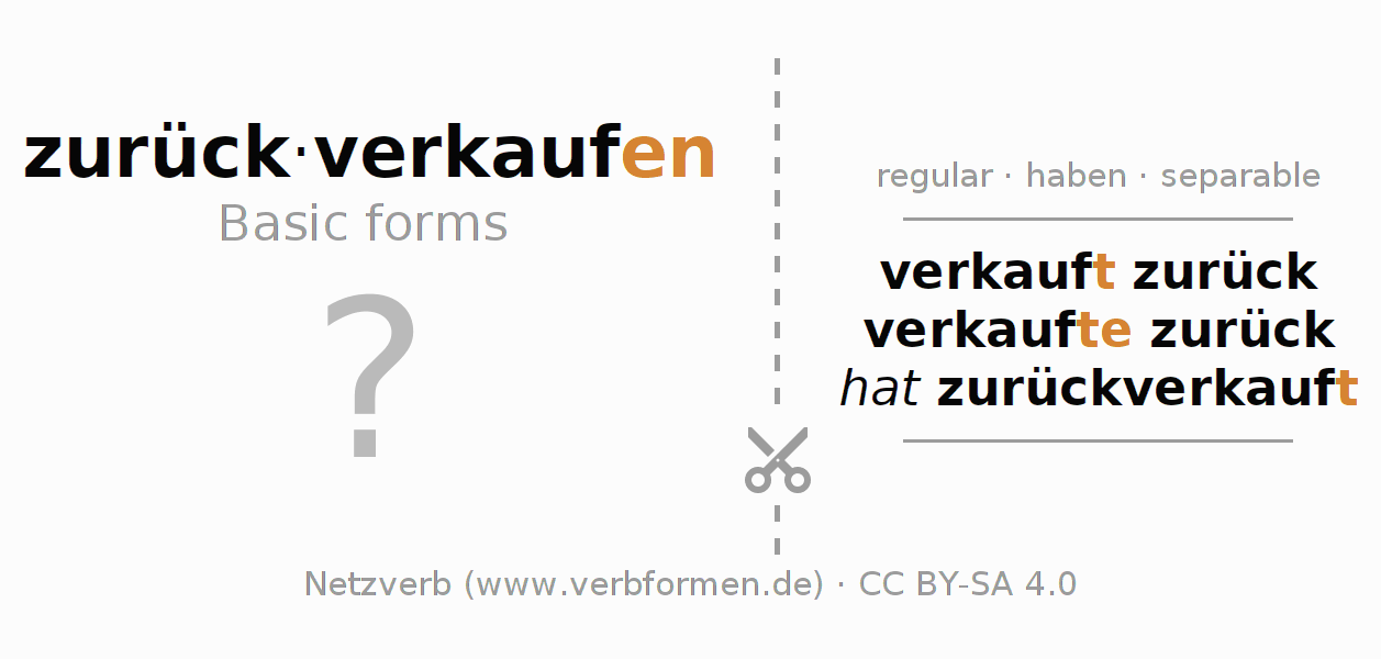 With the flash cards the conjugation of the German verbs can be learned and trained. To do this, follow the tasks on the learning sheets for the verb zurückverkaufen. The required verb forms must be solved in the head. They are then compared with the hints on the cards. If agree, you confirm your learning result. If there is a deviation, you should use the hints to memorize the unknown forms. Typically, print the PDF file of the learning cards and fold them as specified. So you can use them on a stack with other verbs for learning. There are also many more worksheets for the verb zurückverkaufen. All materials are available as Open Educational Resources (OER) under license CC BY- SA 4.0 and can be used free of charge.