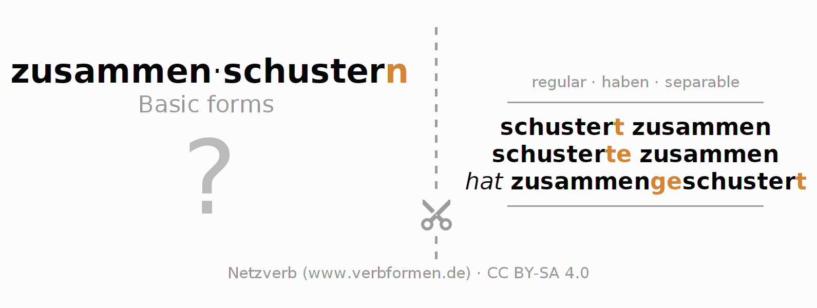 Instruction: Print and cut the learning cards of the zusammenschustern. Then place the individual cards for several verbs on a pile and mix. Now the cards can be drawn. The information on the cards must be read in memory. To match your solution, use the information on the learning sheets.
