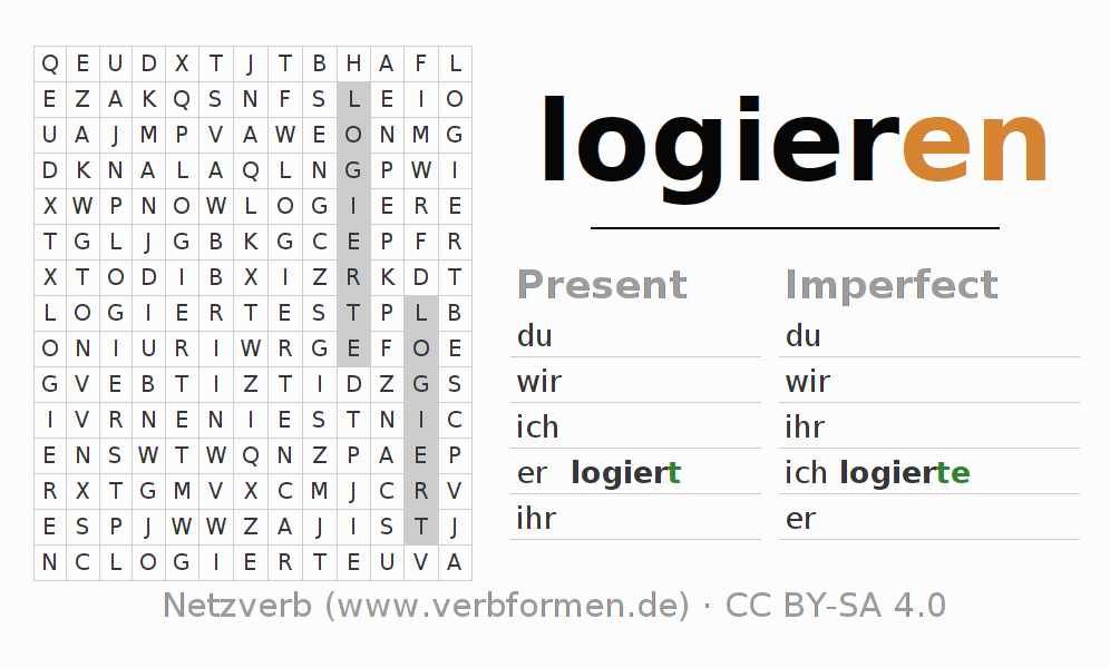 Worksheets are used generally for the conjugation of the verb logieren in teaching. The materials can be used as Open Educational Resources (OER) for exercises, for games and as Tasks (CC BY-SA 4.0). There are many different types of tasks available for the verb logieren. These are overview sheets with complete conjugation, puzzles and games that require joint learning. The entire educational material is available for free as a PDF download, as pictures and as an interactive browser version. In addition to the tasks, countless examples for logieren also provide an aid to using the verb.