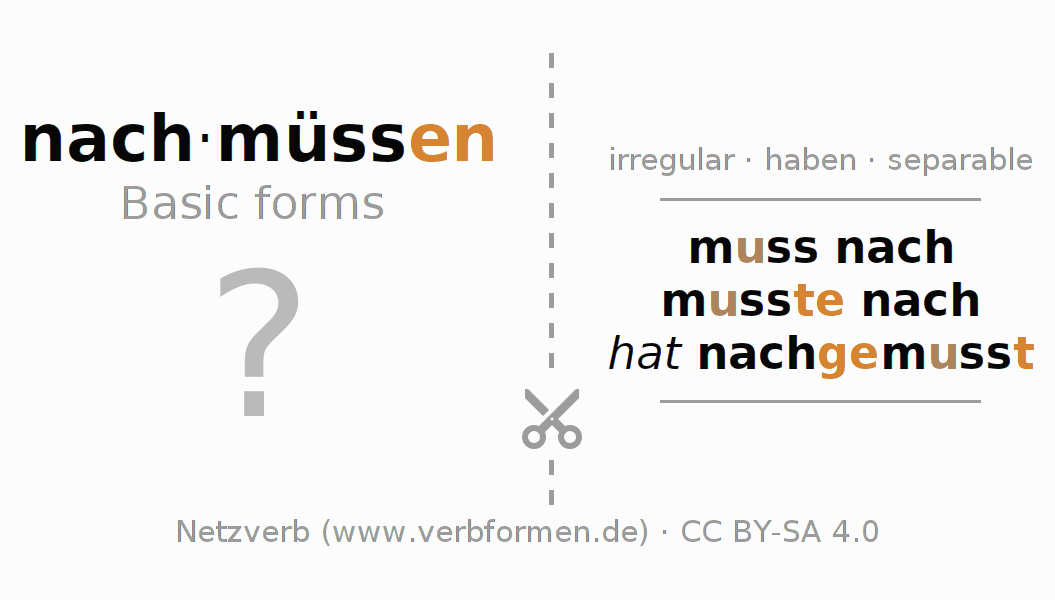 Worksheets are used generally for the conjugation of the verb nachmüssen in teaching. The materials can be used as Open Educational Resources (OER) for exercises, for games and as Tasks (CC BY-SA 4.0). There are many different types of tasks available for the verb nachmüssen. These are overview sheets with complete conjugation, puzzles and games that require joint learning. The entire educational material is available for free as a PDF download, as pictures and as an interactive browser version. In addition to the tasks, countless examples for nachmüssen also provide an aid to using the verb.