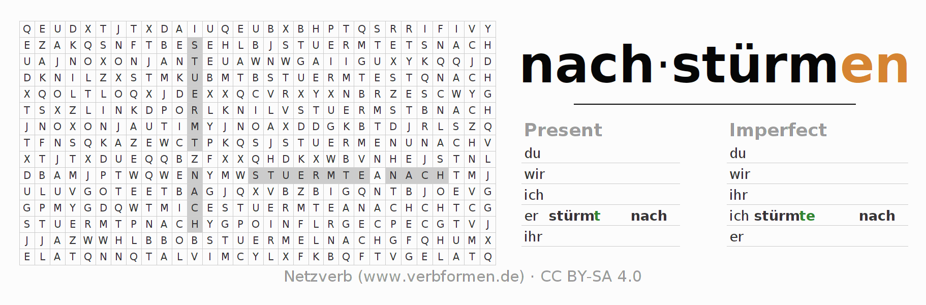 With these search word puzzles you can learn the conjugation of the German verb nachstürmen.