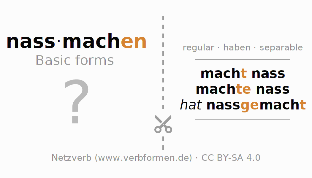 Worksheets are used generally for the conjugation of the verb nassmachen in teaching. The materials can be used as Open Educational Resources (OER) for exercises, for games and as Tasks (CC BY-SA 4.0). There are many different types of tasks available for the verb nassmachen. These are overview sheets with complete conjugation, puzzles and games that require joint learning. The entire educational material is available for free as a PDF download, as pictures and as an interactive browser version. In addition to the tasks, countless examples for nassmachen also provide an aid to using the verb.