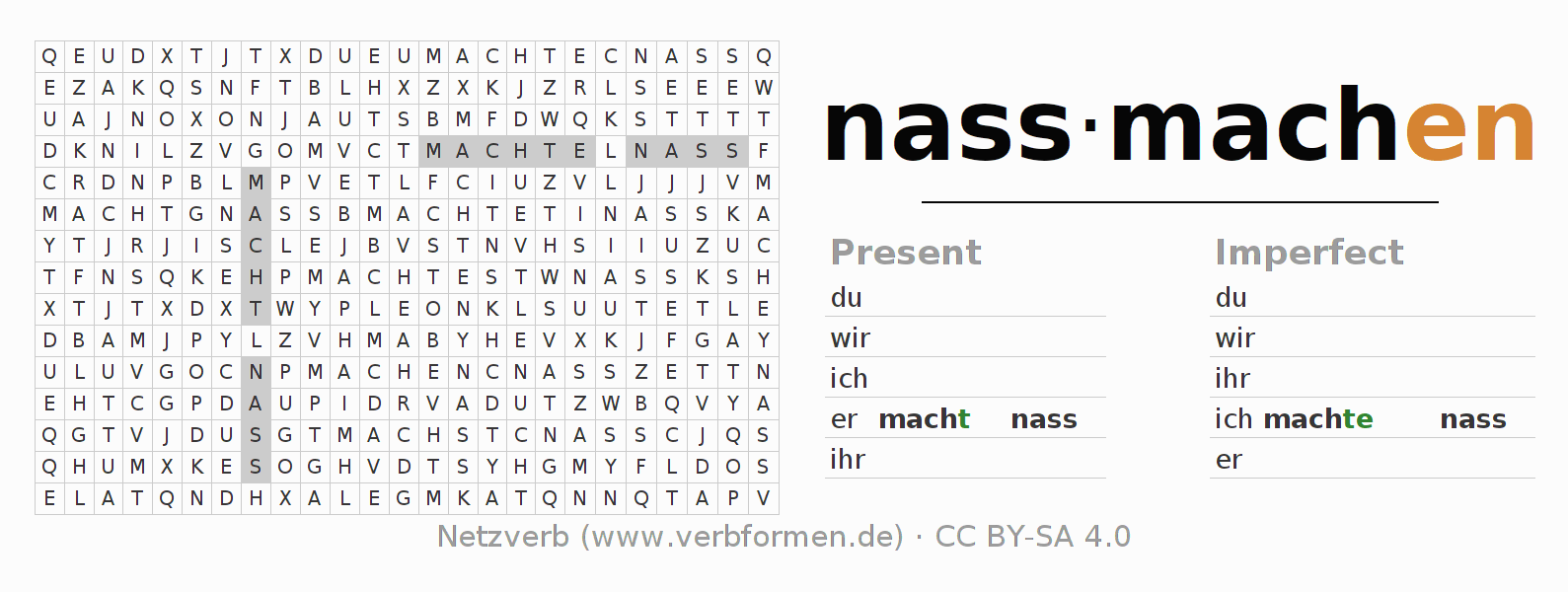 With these search word puzzles you can learn the conjugation of the German verb nassmachen.