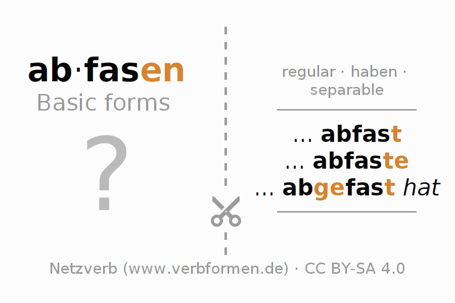 Worksheets are used generally for the conjugation of the verb abfasen in teaching. The materials can be used as Open Educational Resources (OER) for exercises, for games and as Tasks (CC BY-SA 4.0). There are many different types of tasks available for the verb abfasen. These are overview sheets with complete conjugation, puzzles and games that require joint learning. The entire educational material is available for free as a PDF download, as pictures and as an interactive browser version. In addition to the tasks, countless examples for abfasen also provide an aid to using the verb.