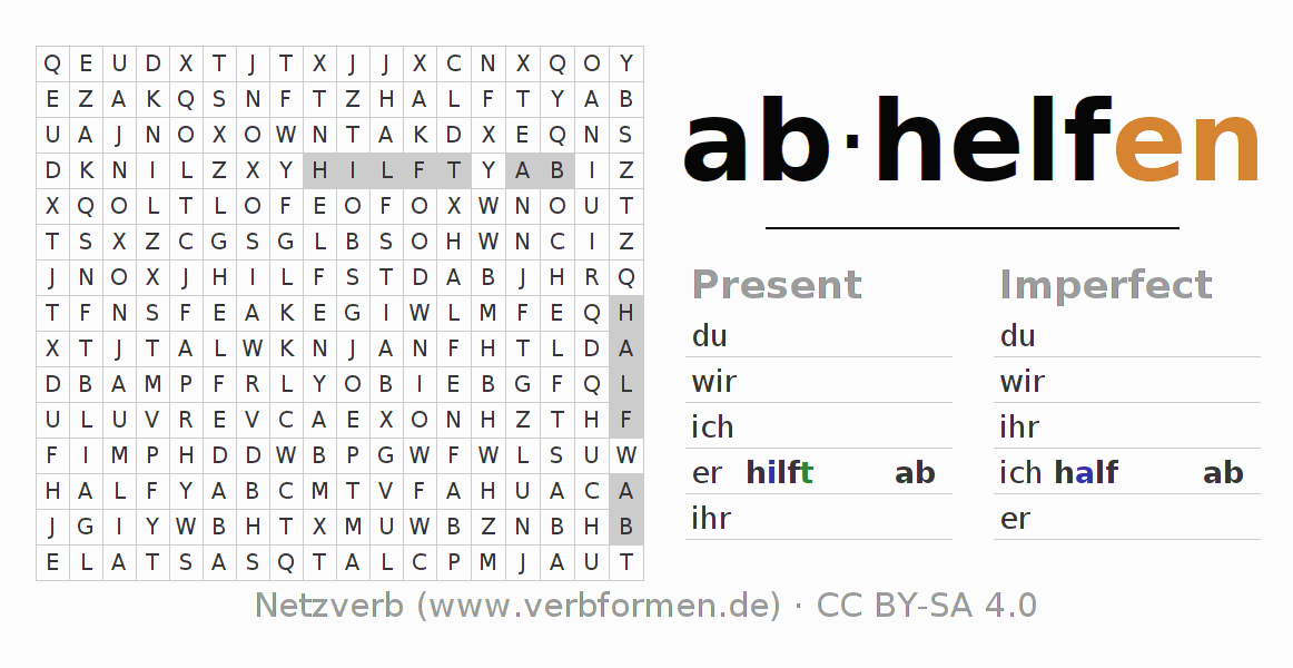 With these search word puzzles you can learn the conjugation of the German verb abhelfen.