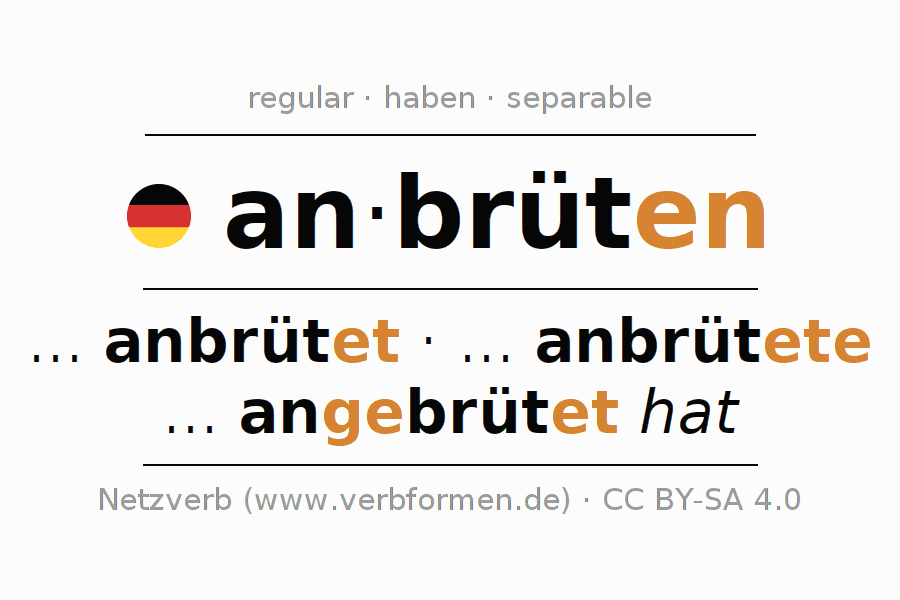 Worksheets are used generally for the conjugation of the verb anbrüten in teaching. The materials can be used as Open Educational Resources (OER) for exercises, for games and as Tasks (CC BY-SA 4.0). There are many different types of tasks available for the verb anbrüten. These are overview sheets with complete conjugation, puzzles and games that require joint learning. The entire educational material is available for free as a PDF download, as pictures and as an interactive browser version. In addition to the tasks, countless examples for anbrüten also provide an aid to using the verb.