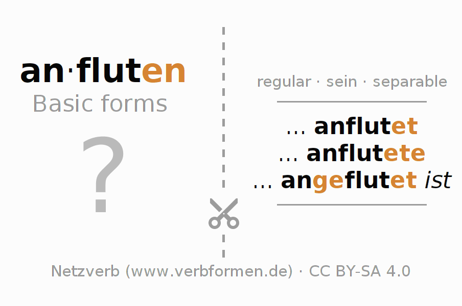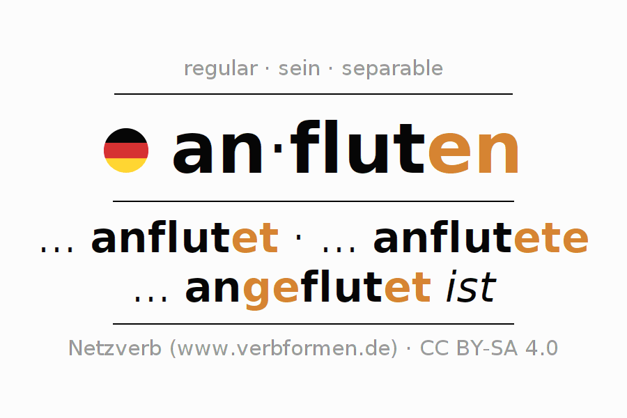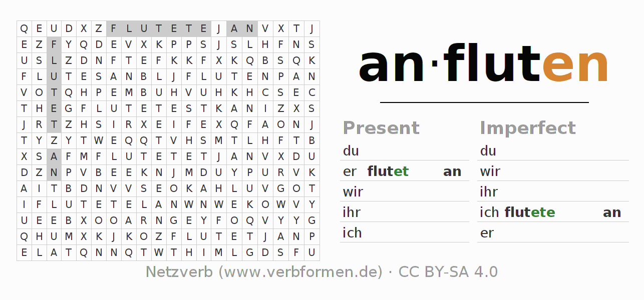 Worksheets are used generally for the conjugation of the verb anfluten in teaching. The materials can be used as Open Educational Resources (OER) for exercises, for games and as Tasks (CC BY-SA 4.0). There are many different types of tasks available for the verb anfluten. These are overview sheets with complete conjugation, puzzles and games that require joint learning. The entire educational material is available for free as a PDF download, as pictures and as an interactive browser version. In addition to the tasks, countless examples for anfluten also provide an aid to using the verb.