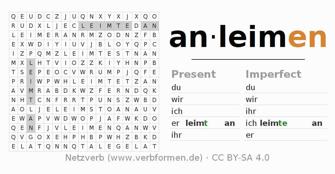 With these search word puzzles you can learn the conjugation of the German verb anleimen.