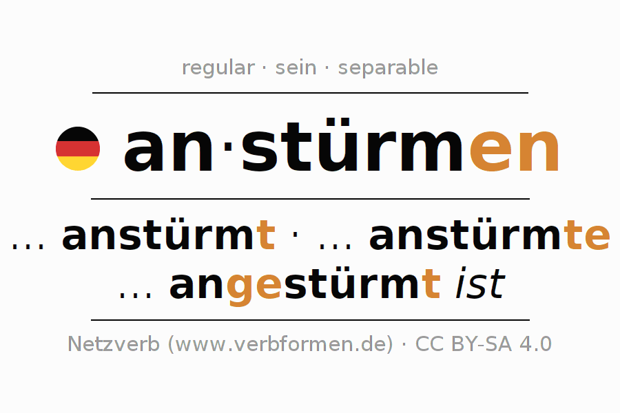 Worksheets are used generally for the conjugation of the verb anstürmen in teaching. The materials can be used as Open Educational Resources (OER) for exercises, for games and as Tasks (CC BY-SA 4.0). There are many different types of tasks available for the verb anstürmen. These are overview sheets with complete conjugation, puzzles and games that require joint learning. The entire educational material is available for free as a PDF download, as pictures and as an interactive browser version. In addition to the tasks, countless examples for anstürmen also provide an aid to using the verb.