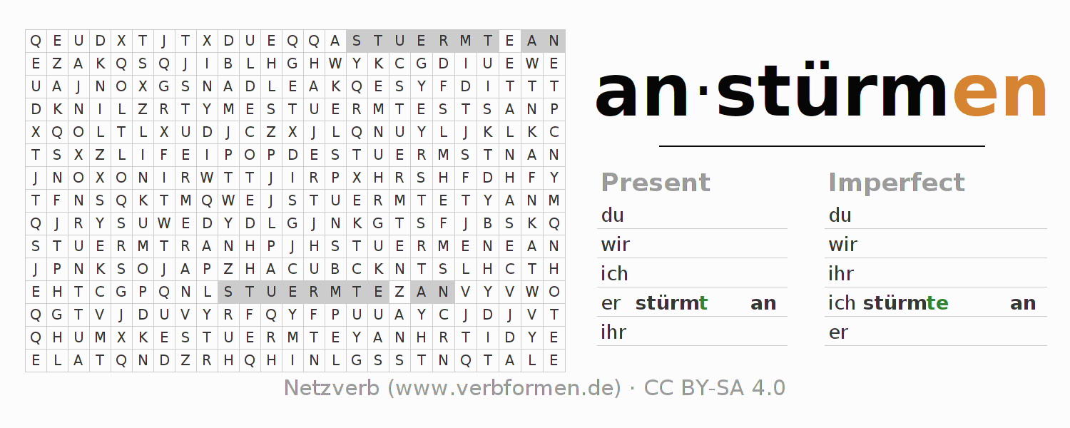 With these search word puzzles you can learn the conjugation of the German verb anstürmen.