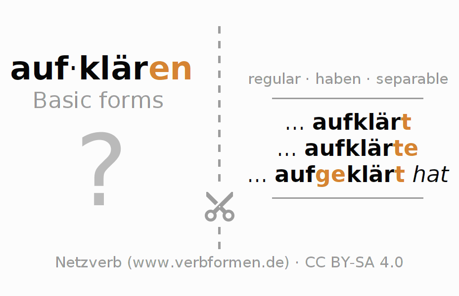 Worksheets are used generally for the conjugation of the verb aufklären in teaching. The materials can be used as Open Educational Resources (OER) for exercises, for games and as Tasks (CC BY-SA 4.0). There are many different types of tasks available for the verb aufklären. These are overview sheets with complete conjugation, puzzles and games that require joint learning. The entire educational material is available for free as a PDF download, as pictures and as an interactive browser version. In addition to the tasks, countless examples for aufklären also provide an aid to using the verb.