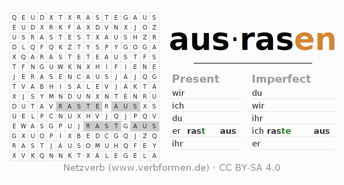 Worksheets are used generally for the conjugation of the verb ausrasen in teaching. The materials can be used as Open Educational Resources (OER) for exercises, for games and as Tasks (CC BY-SA 4.0). There are many different types of tasks available for the verb ausrasen. These are overview sheets with complete conjugation, puzzles and games that require joint learning. The entire educational material is available for free as a PDF download, as pictures and as an interactive browser version. In addition to the tasks, countless examples for ausrasen also provide an aid to using the verb.