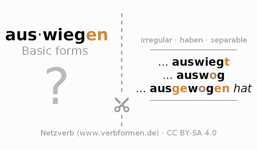 Worksheets are used generally for the conjugation of the verb auswiegen in teaching. The materials can be used as Open Educational Resources (OER) for exercises, for games and as Tasks (CC BY-SA 4.0). There are many different types of tasks available for the verb auswiegen. These are overview sheets with complete conjugation, puzzles and games that require joint learning. The entire educational material is available for free as a PDF download, as pictures and as an interactive browser version. In addition to the tasks, countless examples for auswiegen also provide an aid to using the verb.