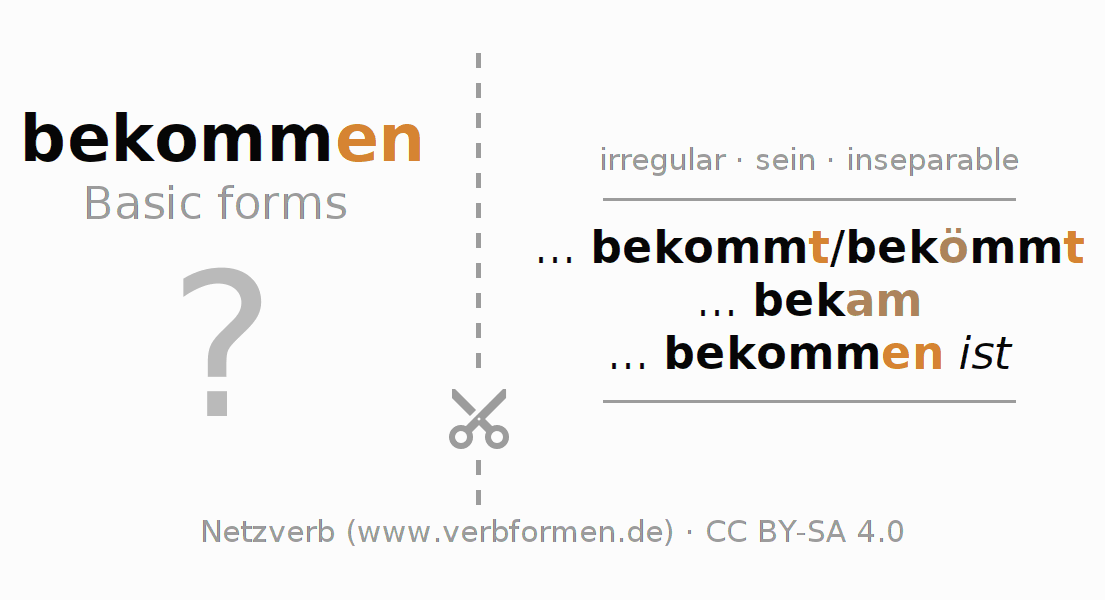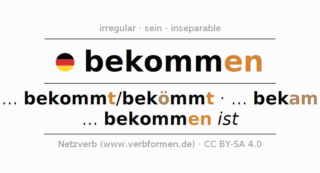 Worksheets are used generally for the conjugation of the verb bekommen in teaching. The materials can be used as Open Educational Resources (OER) for exercises, for games and as Tasks (CC BY-SA 4.0). There are many different types of tasks available for the verb bekommen (ist). These are overview sheets with complete conjugation, puzzles and games that require joint learning. The entire educational material is available for free as a PDF download, as pictures and as an interactive browser version. In addition to the tasks, countless examples for bekommen also provide an aid to using the verb.