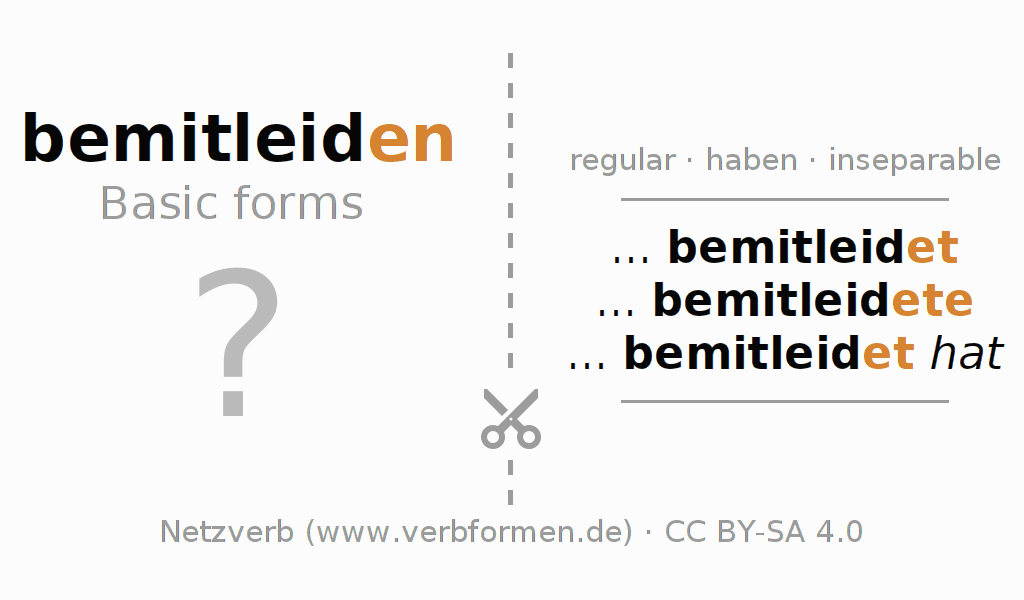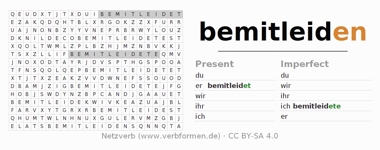 Worksheets are used generally for the conjugation of the verb bemitleiden in teaching. The materials can be used as Open Educational Resources (OER) for exercises, for games and as Tasks (CC BY-SA 4.0). There are many different types of tasks available for the verb bemitleiden. These are overview sheets with complete conjugation, puzzles and games that require joint learning. The entire educational material is available for free as a PDF download, as pictures and as an interactive browser version. In addition to the tasks, countless examples for bemitleiden also provide an aid to using the verb.