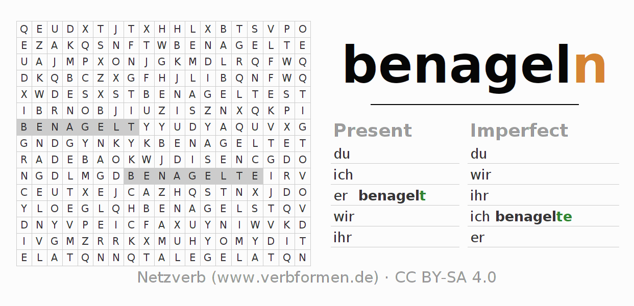 Worksheets are used generally for the conjugation of the verb benageln in teaching. The materials can be used as Open Educational Resources (OER) for exercises, for games and as Tasks (CC BY-SA 4.0). There are many different types of tasks available for the verb benageln. These are overview sheets with complete conjugation, puzzles and games that require joint learning. The entire educational material is available for free as a PDF download, as pictures and as an interactive browser version. In addition to the tasks, countless examples for benageln also provide an aid to using the verb.