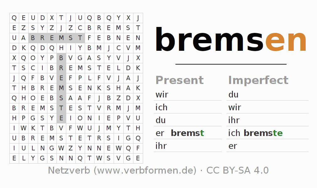 With these search word puzzles you can learn the conjugation of the German verb bremsen.