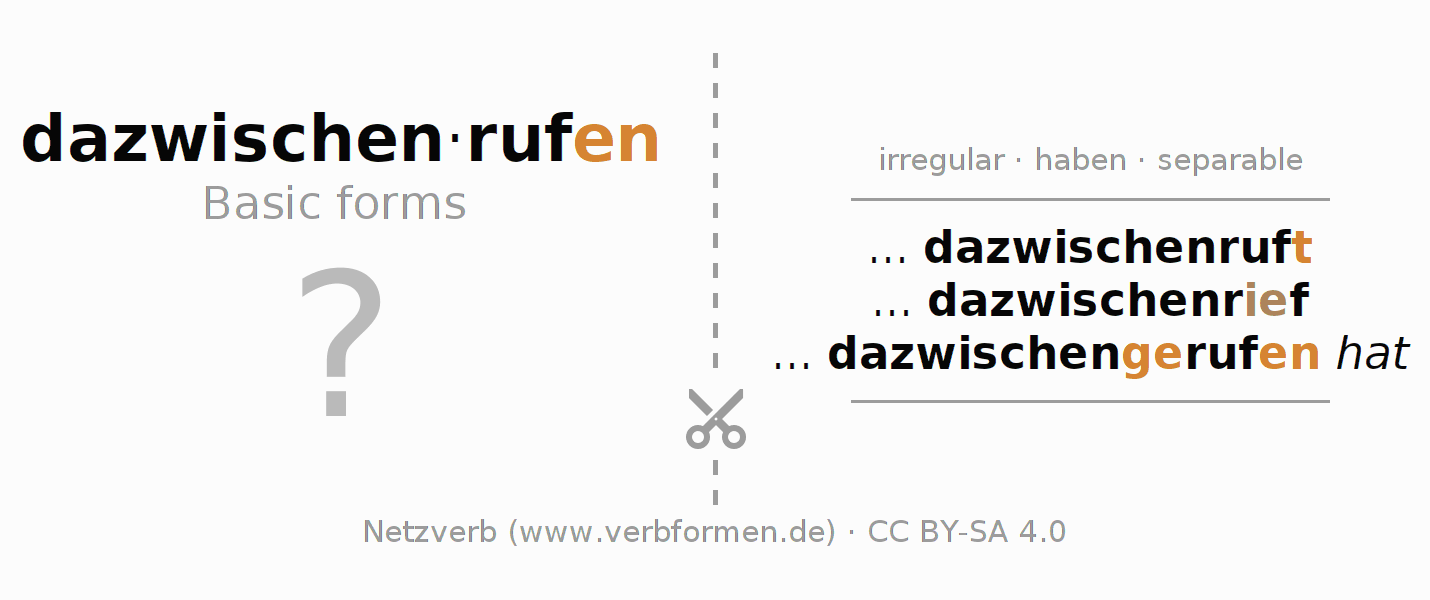 Flash cards, learning cards, learning notes for all tenses of the verb dazwischenrufen