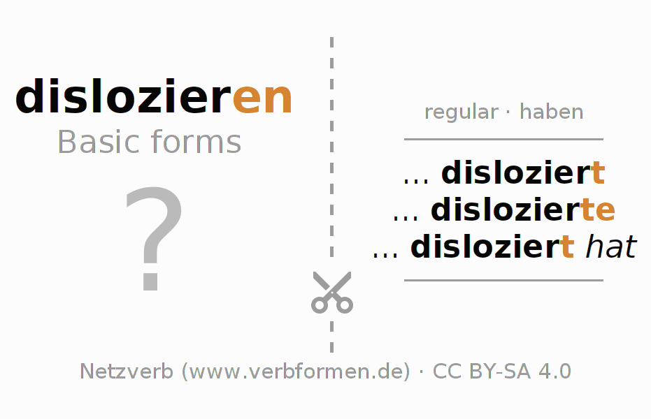 Worksheets are used generally for the conjugation of the verb dislozieren in teaching. The materials can be used as Open Educational Resources (OER) for exercises, for games and as Tasks (CC BY-SA 4.0). There are many different types of tasks available for the verb dislozieren. These are overview sheets with complete conjugation, puzzles and games that require joint learning. The entire educational material is available for free as a PDF download, as pictures and as an interactive browser version. In addition to the tasks, countless examples for dislozieren also provide an aid to using the verb.