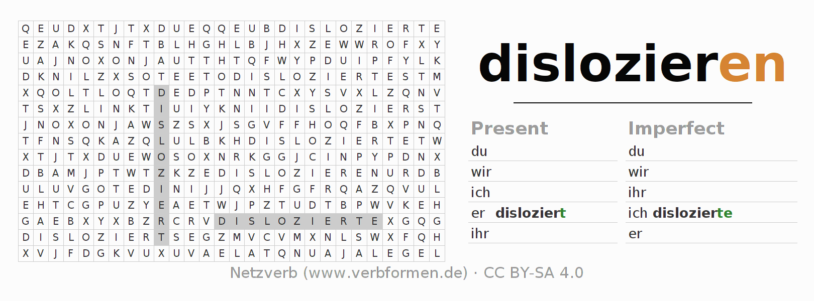 With these search word puzzles you can learn the conjugation of the German verb dislozieren.