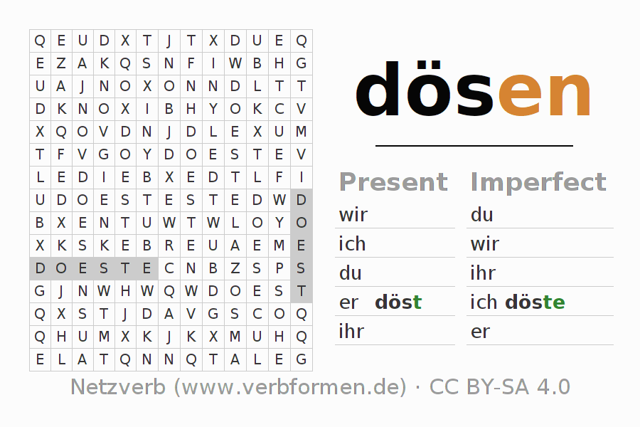 Worksheets are used generally for the conjugation of the verb dösen in teaching. The materials can be used as Open Educational Resources (OER) for exercises, for games and as Tasks (CC BY-SA 4.0). There are many different types of tasks available for the verb dösen. These are overview sheets with complete conjugation, puzzles and games that require joint learning. The entire educational material is available for free as a PDF download, as pictures and as an interactive browser version. In addition to the tasks, countless examples for dösen also provide an aid to using the verb.