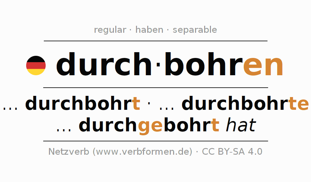Worksheets are used generally for the conjugation of the verb durchbohren in teaching. The materials can be used as Open Educational Resources (OER) for exercises, for games and as Tasks (CC BY-SA 4.0). There are many different types of tasks available for the verb durch-bohren. These are overview sheets with complete conjugation, puzzles and games that require joint learning. The entire educational material is available for free as a PDF download, as pictures and as an interactive browser version. In addition to the tasks, countless examples for durchbohren also provide an aid to using the verb.
